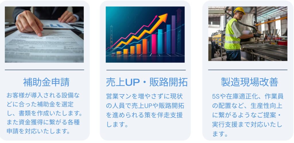 補助金支援・販路開拓・製造現場改善などを対応しています。